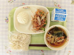『牛乳、五目うどん、彩の国肉まん、かみかみあえ』