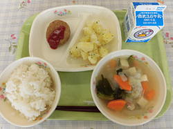 『牛乳、ご飯、ハンバーグ、温野菜、豆腐と野菜のコンソメスープ』