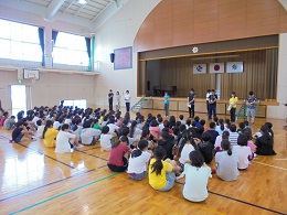 6月の全校朝会は、学校教育目標「かしこく なかよく たくましく」を達成するために、具体的にどんなことを頑張ったらよいか各先生方から話がありました。1学期もあと1ヶ月。実りあるしめくくりをする確認ができました。