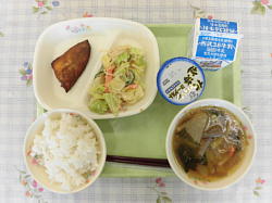 『牛乳、ご飯、サバのサラサ焼き、春のゴママヨネーズ和え、野菜椀、ヨーグルト』