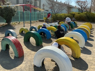今日は、みんなが大好きなタイヤにペンキを塗ってくれていました。