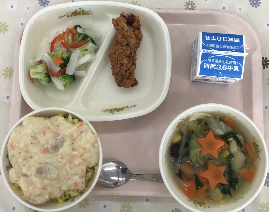 給食ではフライドチキン、クリスマスカラーの