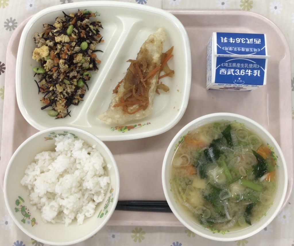 鶏ひき肉にしょうが、人参、ひじき、炒り卵、