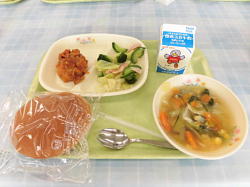 「牛乳、子どもパンスライス、ハンバーグデミグラスソース、ブロッコリーサラダ、野菜コンソメスープ」