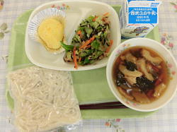 『牛乳、五目うどん、オレンジ蒸しパン、ツナとひじきのサラダ』