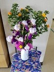 玄関の花です。職員が、いつも季節の花を生けています。今回は、紅花、ジャーマンアイリスなどの花々です。「きれい!」という声が児童からたくさん聞こえてきます。