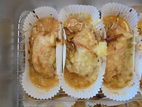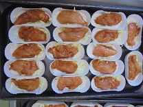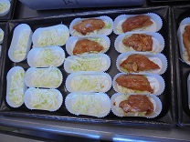 スライスした玉ねぎとキャベツを紙カップに入れ、下味の鶏肉をのせ、とろけるチーズをのせてオーブンで焼きます絵文字:笑顔
